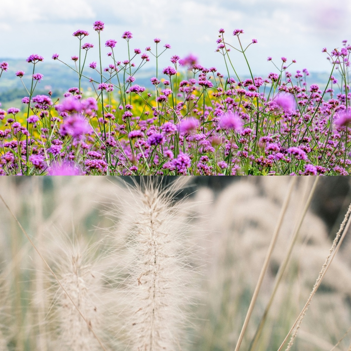 Borderpakket Stella bevat Verbena bonariensis en Pennisetum alopecuroides 'Hameln'. De Verbena steekt met paarse bloempjes hoog boven het grondvlak uit en trekt vlinders aan, terwijl de siergrasjes rust en ritme geven. Samen vormen ze een dynamische border die ook in de late zomer en herfst nog mooi oogt.