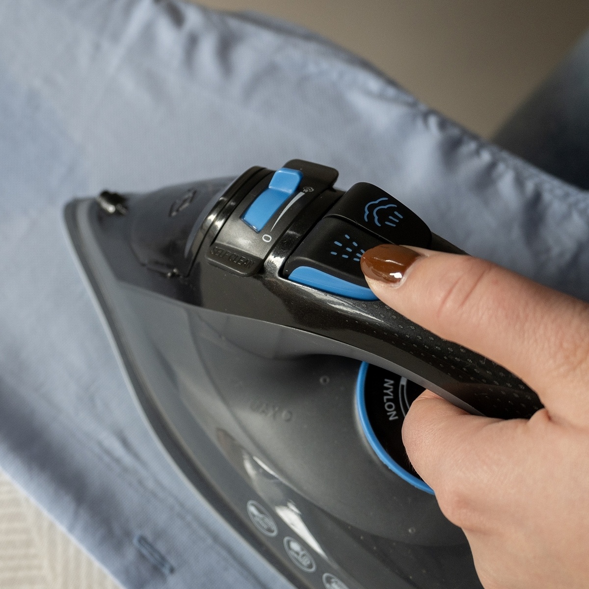 De hoogwaardige antikleef strijkzool glijdt moeiteloos over alle stoffen, zonder te blijven haken of vlekken achter te laten. Zo strijkt u met vertrouwen en behaalt u perfecte resultaten op elk type textiel.