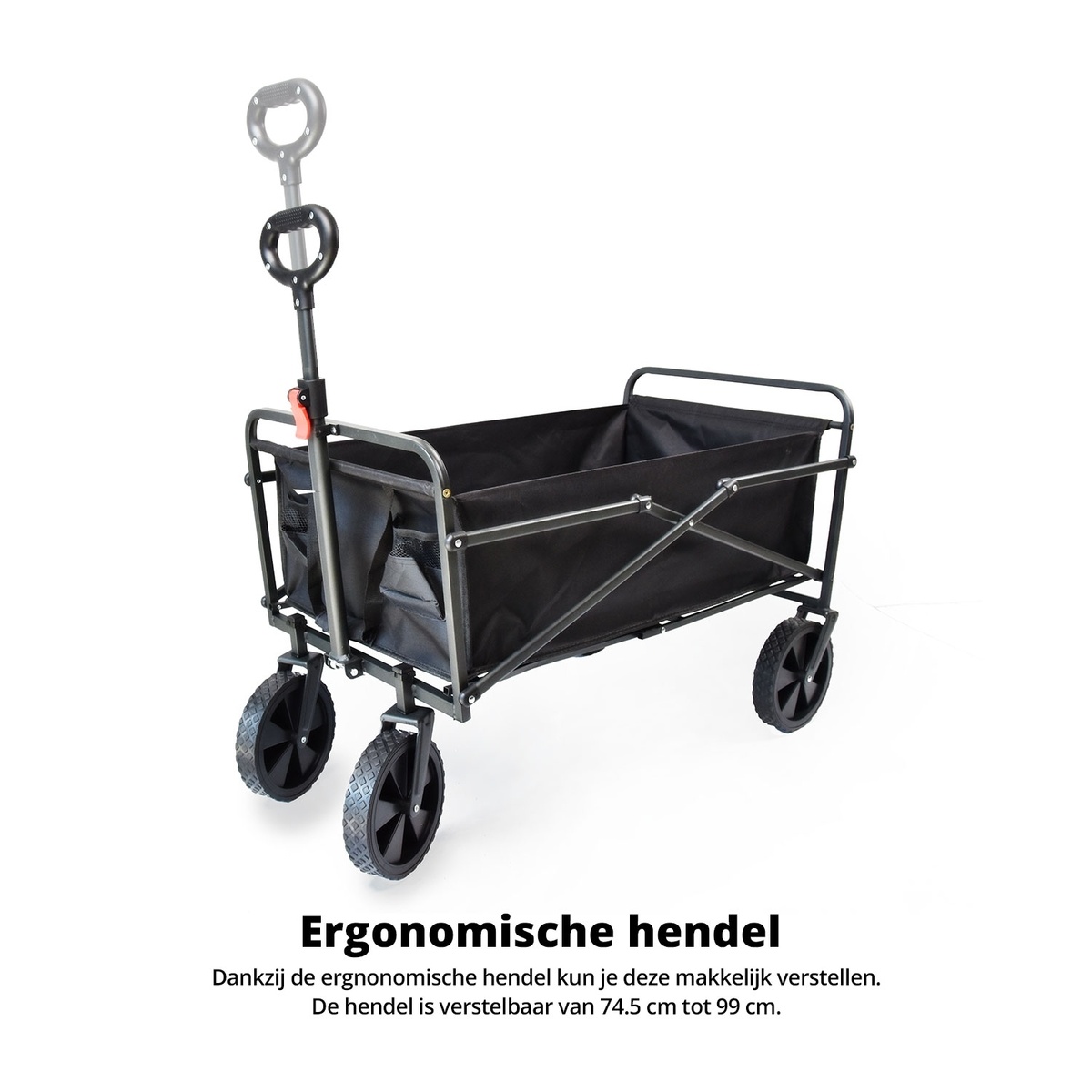 De bolderkar is ontworpen voor gemak en comfort. Het robuuste frame en de stevige banden zorgen voor een soepele rit, zelfs op oneffen terrein. Met een indrukwekkend laadvermogen en handige opbergmogelijkheden biedt de bolderkar voldoende ruimte voor al uw spullen. Van koelboxen en strandstoelen tot speelgoed en picknickmanden, met een inhoud van 100 liter kunt u alles moeiteloos meenemen.