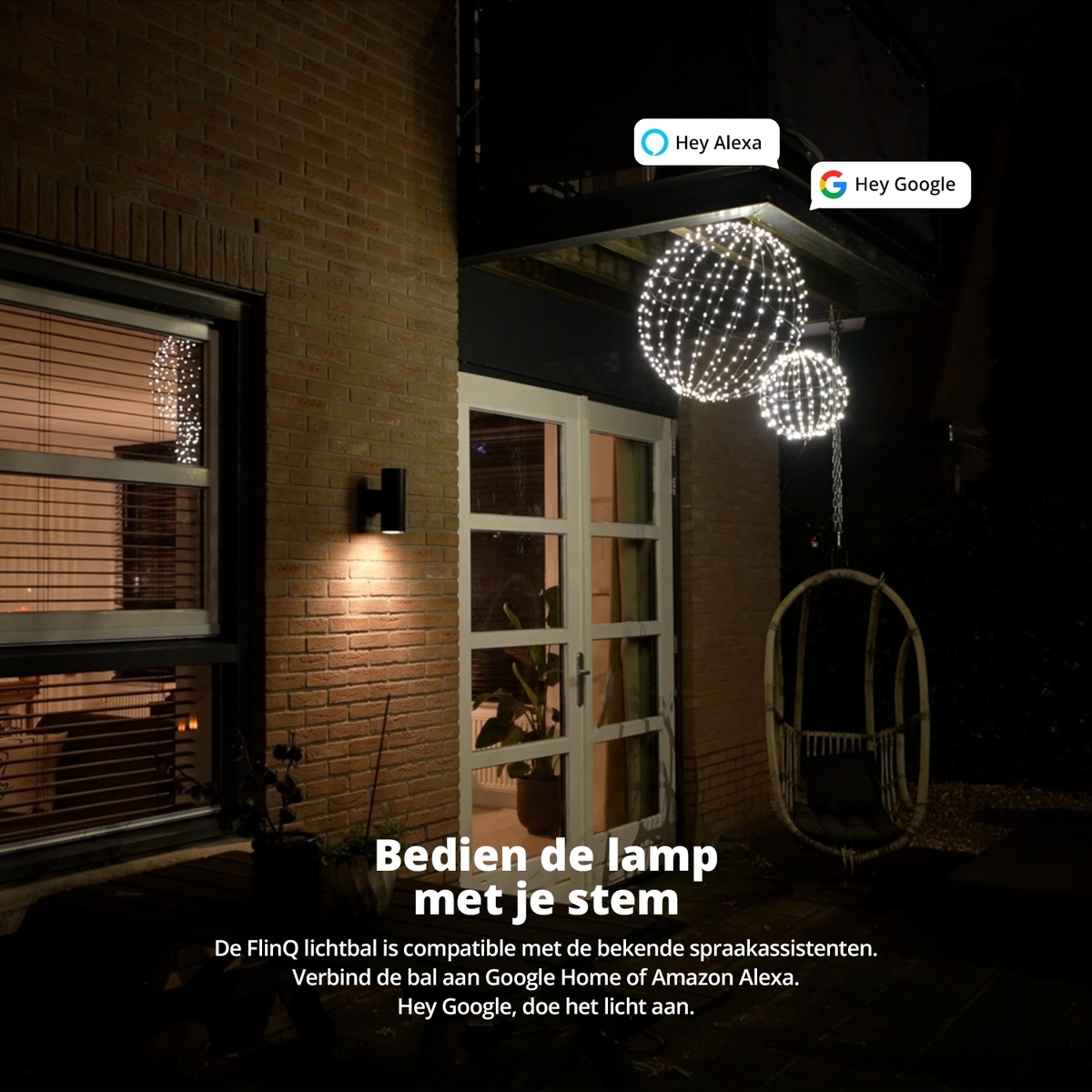 Met de gratis FlinQ-app heeft u volledige controle over de lichtbol. Stel persoonlijke lichtschema’s in, plan timers of laat de verlichting reageren op uw favoriete muziek via Spotify. Bovendien is de lichtbol compatibel met Alexa en Google Assistant, zodat u deze eenvoudig met uw stem kunt bedienen. Uw verlichting aanpassen was nog nooit zo eenvoudig en plezierig.