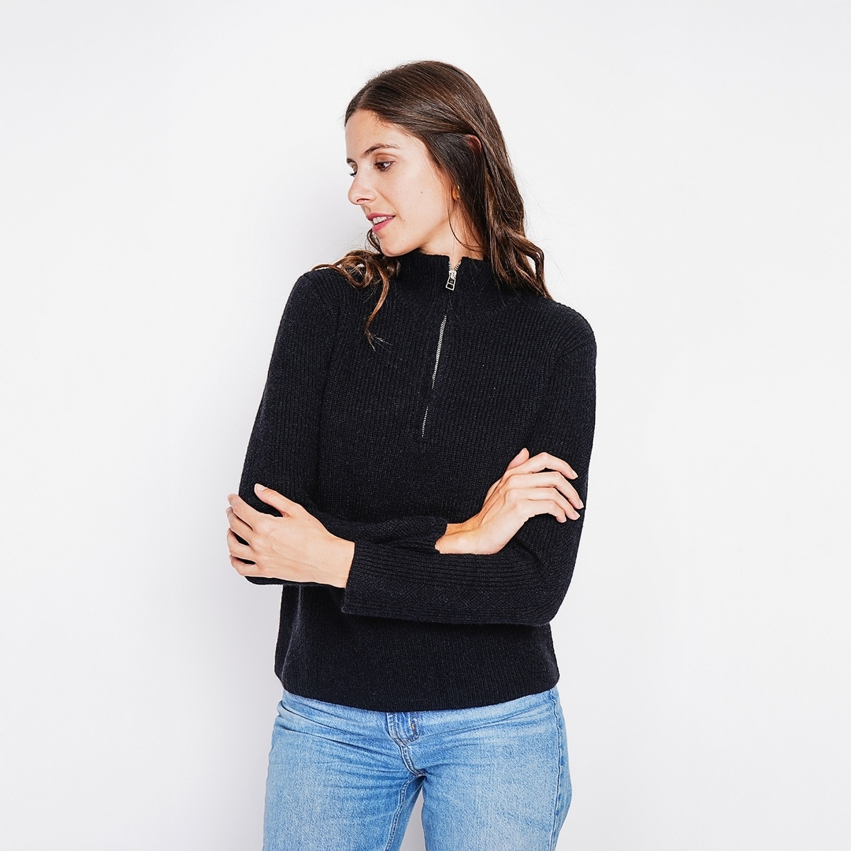Lekker warm met de ribgebreide sweater met hoge kraag en ritssluiting. Dankzij de lange mouwen